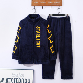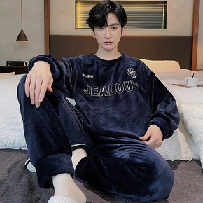 男士睡衣冬季珊瑚绒2022年新款字母刺绣加厚加绒可...
