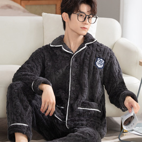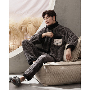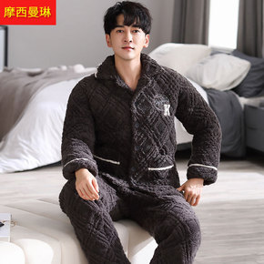 男士睡衣珊瑚绒秋冬款三层夹棉加厚加绒保暖法兰绒青年...