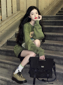 墨绿色加绒卫衣女厚款秋冬季美式复古ins高街套头圆...