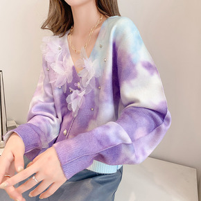 彩色晕染针织开衫女春秋新款宽松重工钉珠时尚短款花朵...