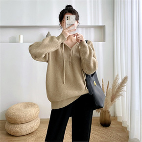 毛衣女宽松外穿秋冬新款慵懒风设计感纯色套头连帽针织...
