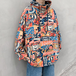 港风男装2022新款春季连帽夹克男涂鸦印花潮流套头...