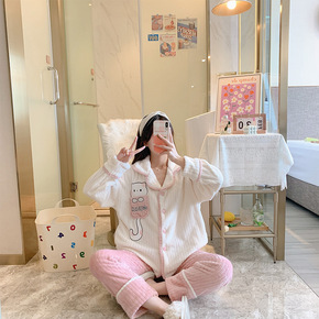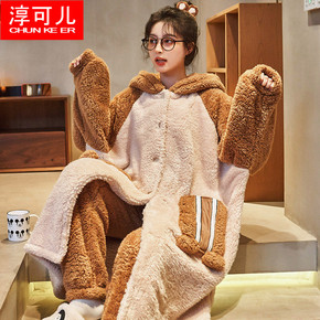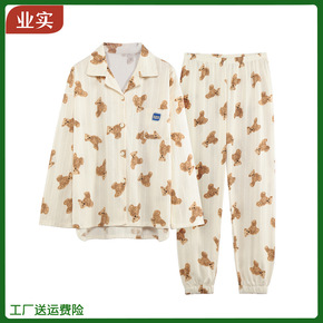 睡衣女长袖春秋棉质冬季韩版休闲可爱卡通小熊开衫可外...