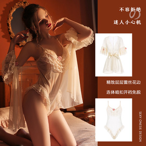 瑰若品牌性感网纱法式蕾丝透视暗扣开档连体衣外袍家居...