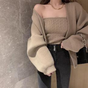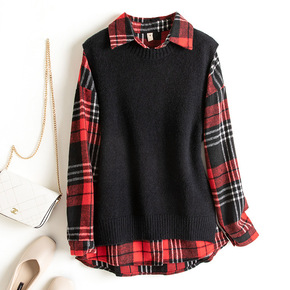 格子衬衫配毛线背心休闲套装女2021秋冬加绒短款韩...