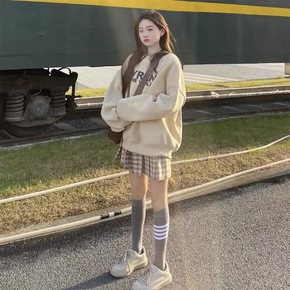 货号:兔子6205 货源类别:现货 风格:休闲 图案:杏色字母卫衣,格纹百褶裙,套装 款式:...