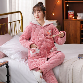 冬季带帽孕妇装开衫睡衣超厚保暖三层夹棉可外穿女士孕...