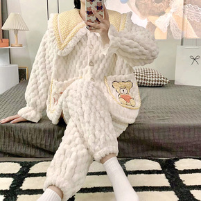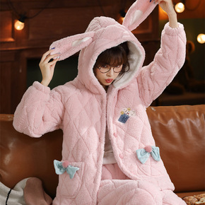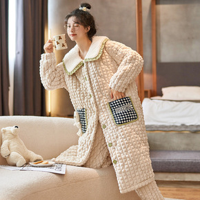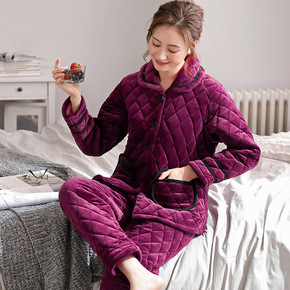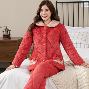 珊瑚绒睡衣女冬款加厚加绒三层夹棉翻领可外穿家居服棉...