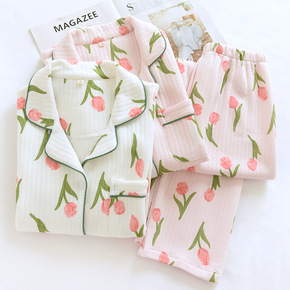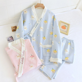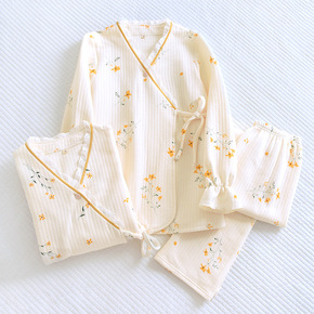 春秋季睡衣女秋冬长袖棉质日系三层夹棉加厚空气棉家居...