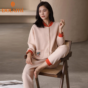 多拉美睡衣女秋冬纯棉长袖薄款夹棉空气棉开衫夹层家居...