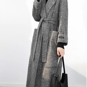 人字纹黑色双面羊绒大衣女中长款冬季加厚千鸟格复古羊...