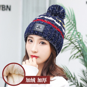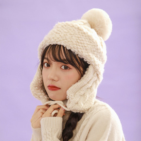 卡蒙日系可爱毛球护耳粗毛线针织帽女秋冬加绒加厚保暖...