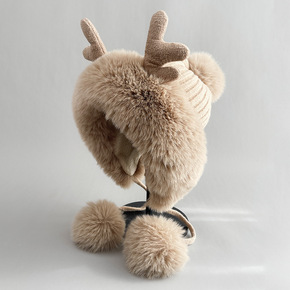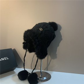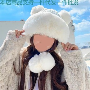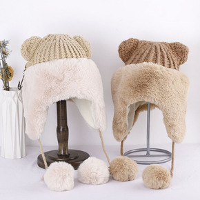帽子女冬季针织帽毛球猫咪仿皮草加绒加厚保暖护耳户外...