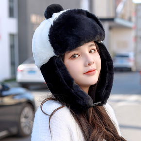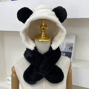 可爱黑白熊猫雷锋帽子女士冬季围脖套头一体帽百搭护耳...
