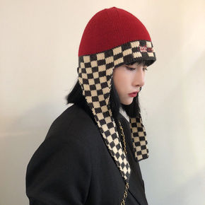 包邮毛线帽女秋冬季棋盘格子雷锋帽保暖护耳飞行帽复古...