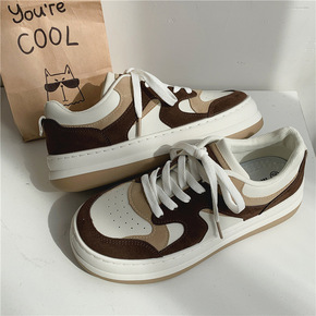 2021秋冬棕色休闲运动鞋女圆头厚底透气女鞋低帮皮...