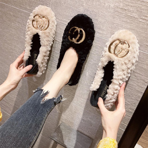 毛毛鞋女冬新款加绒羊羔毛平底外穿豆豆鞋女2021一...