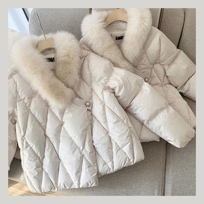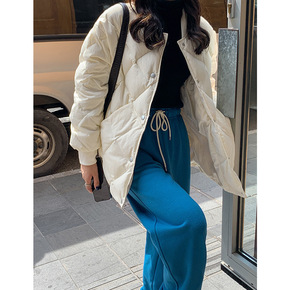 简约菱形格羽绒服外套女2021冬季新款韩版宽松白鸭...
