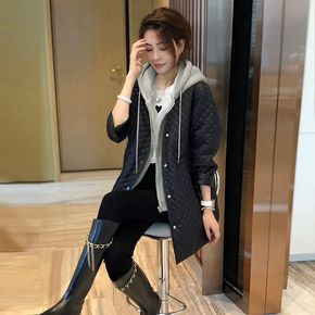 欧货黑色菱格外套女爆款假两件加厚羽绒棉服冬季202...