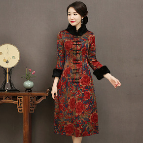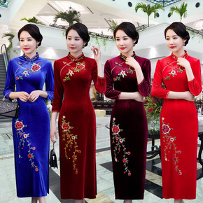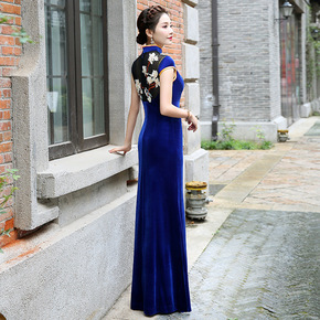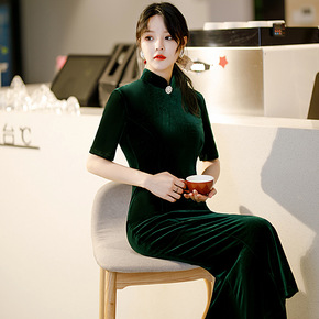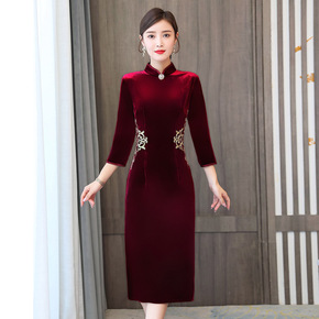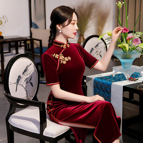 丝绒旗袍露背连衣裙2021年新款绣花长款复古优雅改...