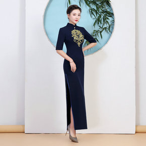 20新款藏青色刺绣金丝绒女长款五分袖复古开叉走秀演...