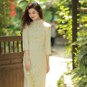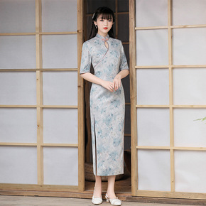 2021春季新款长款丝绸旗袍改良日常聚会旗袍清新短...