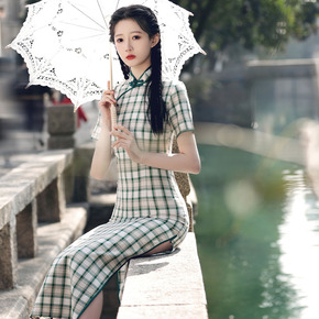 春夏新款棉格子旗袍长款修身显瘦文艺民族风改良淑女气...