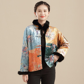 丝绒拼接棉上衣毛边长袖改良时尚唐装女2021冬季国...