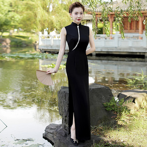 走秀旗袍2021新款黑色优雅修身模特演出礼服改良款...