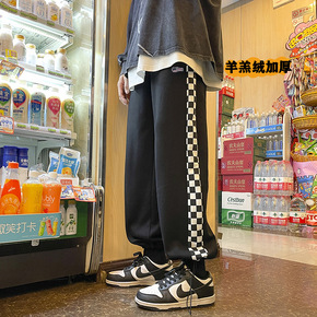 棉运动裤男2022春秋韩版潮流拼色棋盘格休闲裤男收...
