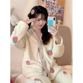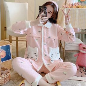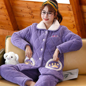 睡衣女士冬季三层厚法兰绒睡衣套装秋天保暖珊瑚绒夹棉...