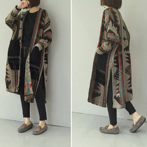 2022冬季新款女装民族风花色大开叉口袋拼接流苏加...
