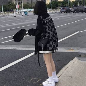 高档棋盘格棒球服外套女潮ins秋冬款外穿宽松韩版学...