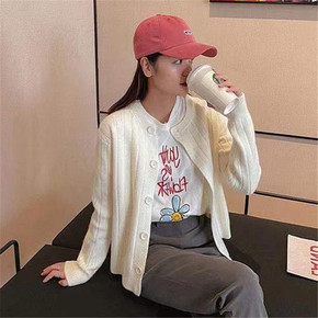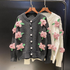 2021秋冬新款宽松韩版针织开衫女重工立体刺绣花朵...