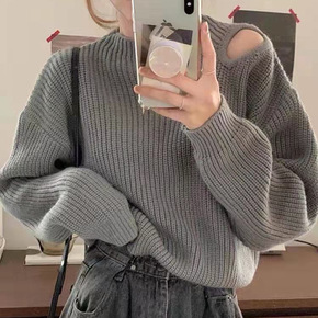 韩版慵懒风露肩针织衫长袖个性毛衣女潮小心机镂空设计...