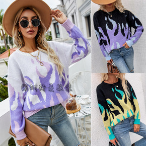 2021秋冬针织中长款圆领套头欧美街头潮人印花宽松...