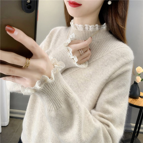 秋冬新款法式甜美气质圆领蕾丝拼接长袖针织衫套头打底...