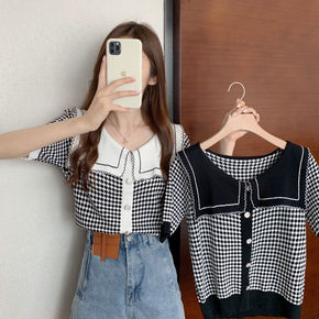 女装2022韩版气质海军领短袖单排扣格子提花宽松短...