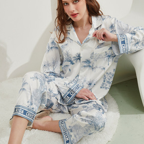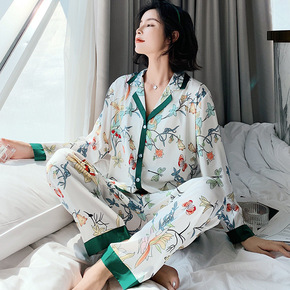 睡衣女夏季薄款缎面雪纺长袖两件套韩版时尚家居服套装...