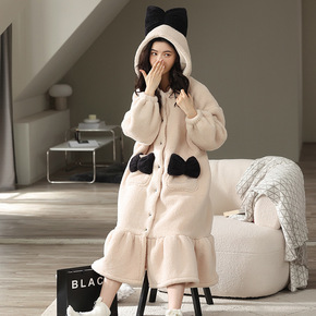 冬季加厚女士长毛绒睡袍保暖法兰绒睡衣珊瑚绒中长款浴...