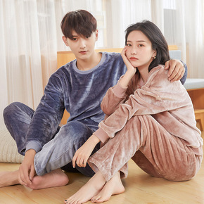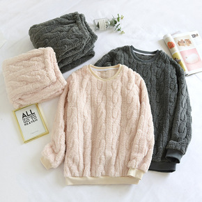 秋冬季情侣提花睡衣女法兰绒加厚加绒保暖套头男家居服...