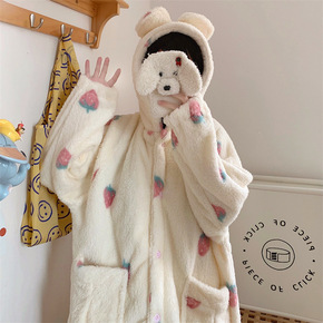 草莓熊睡衣女秋冬珊瑚绒长款睡袍家居服套装秋冬款加绒...