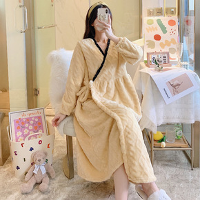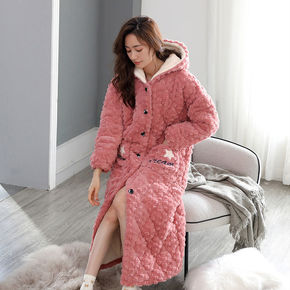 睡衣女秋冬季加绒加厚长款珊瑚绒睡袍三层夹棉保暖带帽...