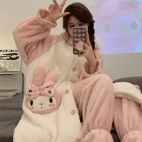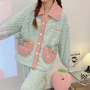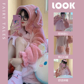 珊瑚绒睡衣女秋冬加厚加绒网红风可爱草莓兔法兰绒家居...