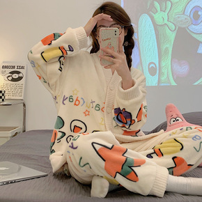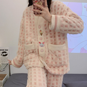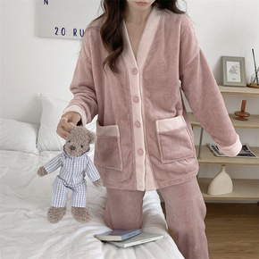 冬季法兰绒开衫睡衣女时尚可爱v领对襟柔软珊瑚绒家居...