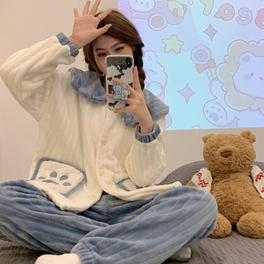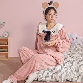 冬季新款法兰绒睡衣女可爱甜美加厚加绒保暖珊瑚绒家居...
