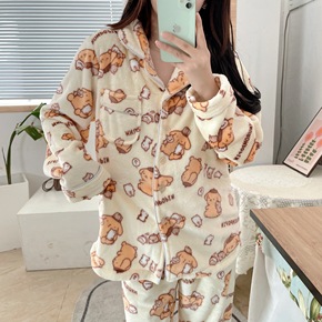 秋冬季网红法兰绒睡衣女加厚保暖珊瑚绒卡通甜美可爱家...