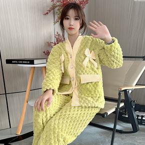 牛油果绿秋冬睡衣女加绒加厚珊瑚绒甜美可爱云朵绒家居...