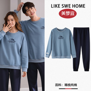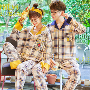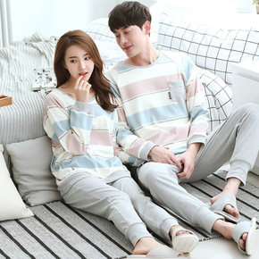 简约休闲新款情侣睡衣全棉一男一女长袖套装春秋季纯棉...