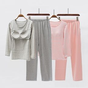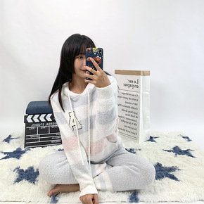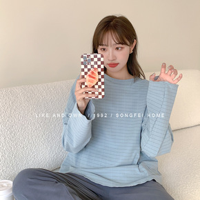 韩版休闲简约睡衣女秋冬德绒磨毛圆领可爱横条女士可外...
